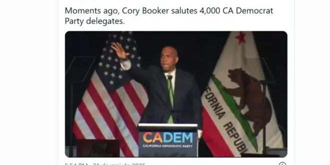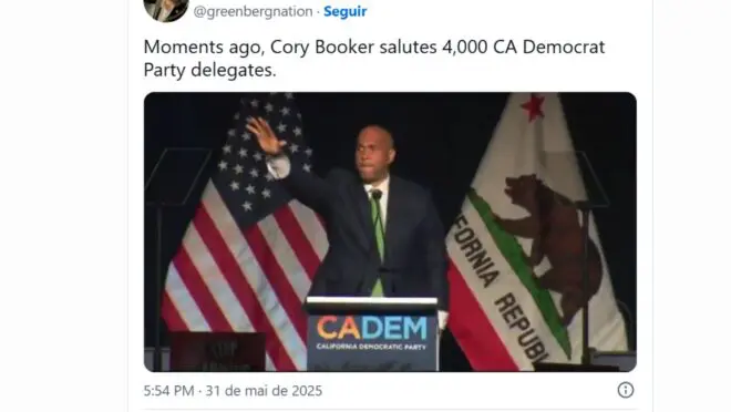 “Momentos atrás, Cory Booker saúda 4 mil delegados do Partido Democrata da Califórnia”, escreveu Greenberg no X.
