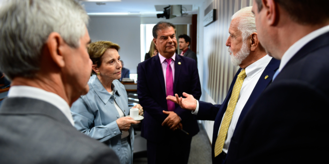 Parte da comitiva de senadores que pretende negociar as tarifas de 50% sobre produtos brasileiros chegou aos Estados Unidos neste sábado (26). Cinco dos oito parlamentares que formam o grupo tiveram uma primeira reunião para “alinhar” os temas que serão discutidos: Tereza Cristina (PP-MS), Nelsinho Trad (PSD-MS), Esperidião Amin (PP-SC), Fernando Farias (MDB-AL) e Marcos Pontes (PL-SP).