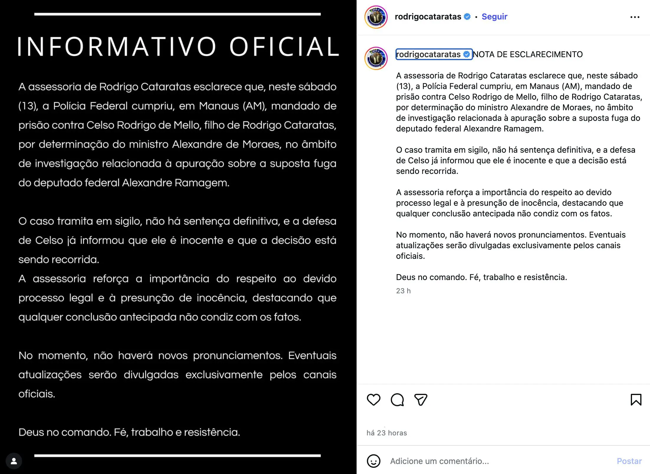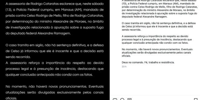 A assessoria de Rodrigo Cataratas esclarece que, neste sábado (13), a Polícia Federal cumpriu, em Manaus (AM), mandado de prisão contra Celso Rodrigo de Mello, filho de Rodrigo Cataratas, por determinação do ministro Alexandre de Moraes, no âmbito de investigação relacionada à apuração sobre a suposta fuga do deputado federal Alexandre Ramagem.