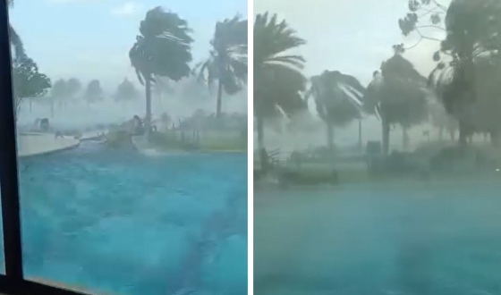 Nas imagens, é possível ouvir choros de criança e adultos falando alto enquanto a ventania balança as árvores do lado de fora, assim como faz verdadeiras ondas na piscina.