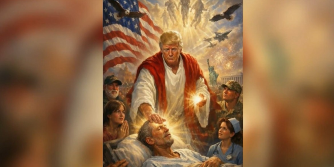 A imagem, aparentemente gerada por inteligência artificial (IA), mostrava Trump cercado por militares, profissionais de saúde e uma mulher rezando, enquanto curava um enfermo deitado em uma cama. Ao fundo, apareciam a bandeira americana, duas águias, soldados retratados como anjos no céu, além da Estátua da Liberdade e outros monumentos icônicos dos Estados Unidos. O post gerou diversas críticas nos EUA.