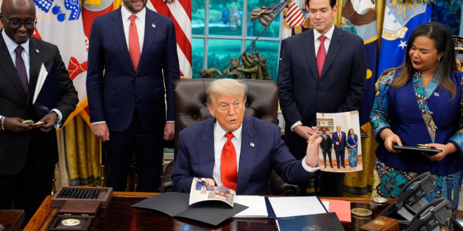 O presidente dos Estados Unidos, Donald Trump, celebrou nesta sexta-feira (27), na Casa Branca, a assinatura do acordo de paz histórico entre Ruanda e República Democrática do Congo, que encerra décadas de conflito na África Central. O pacto, mediado pelo governo americano, foi firmado em Washington na presença dos ministros das Relações Exteriores dos dois países, do secretário de Estado dos EUA, Marco Rubio, e do vice-presidente americano, J.D. Vance.