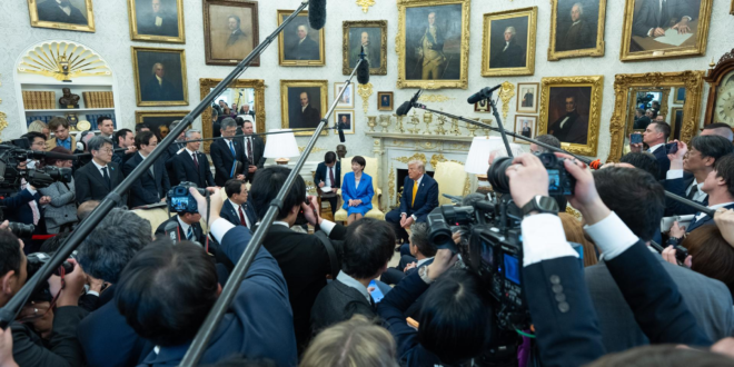 O presidente dos EUA, Donald Trump, se reuniu na Casa Branca com a primeira-ministra japonesa, Sanae Takaichi, nesta quinta-feira (19), ocasião na qual descartou o deslocamento de tropas americanas ao Oriente Médio.