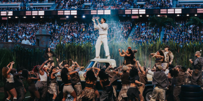 O artista se tornou o primeiro a se apresentar inteiramente em espanhol no show do intervalo do Super Bowl. Quase ao final da apresentação, ele recebeu uma bola de futebol americano com os dizeres “Juntos, somos a América”, uma referência a todos os países que ele citou, incluindo Brasil.