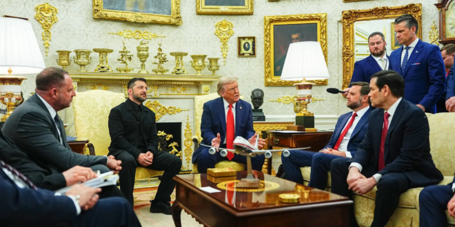 Trump conversa com Zelensky no Salão Oval da Casa Branca, ao lado do seu vice, J.D. Vance, e do secretário de Estado dos EUA, Marco Rubio (Foto: AARON SCHWARTZ/EFE/EPA)