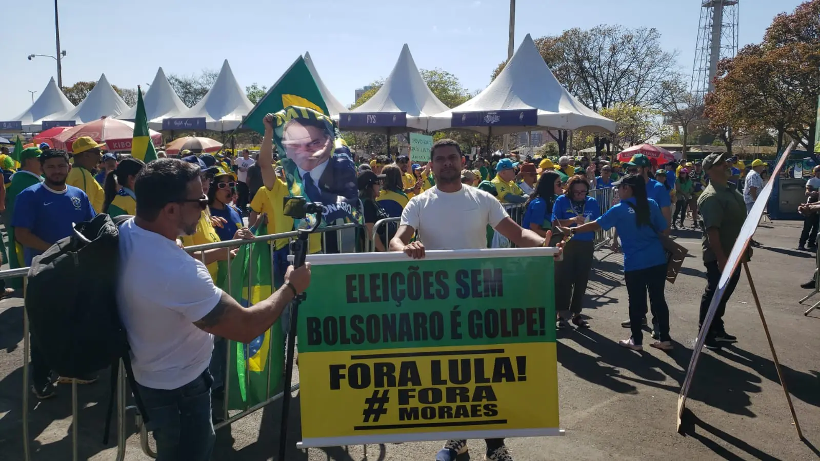 Manifestantes aproveitaram para levar frases em inglês de apoio à pressão de Donald Trump para libertação de Bolsonaro, devido a um processo judicial denunciado por irregularidades, ilícitos e abusos. EFE/ Sebastiao Moreira (Foto: EFE)