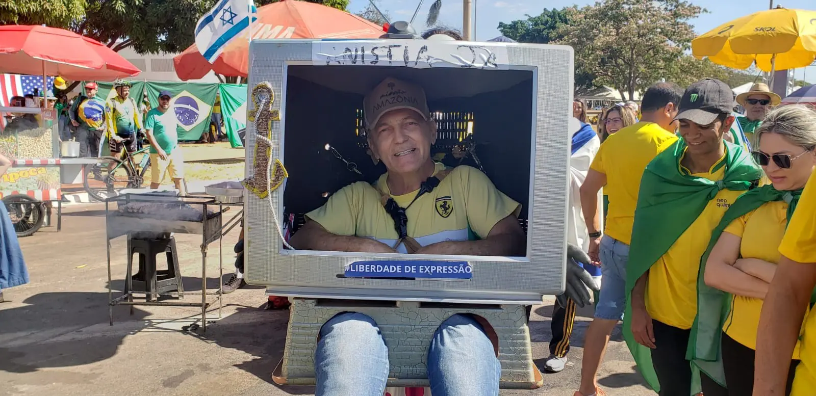 Marcos, um dos participantes dos atos em Brasília, fez uma fantasia para atrair a atenção das pessoas e alertar sobre os riscos às liberdades no Brasil: “Anistia Já”, defende. (Foto: Aline Rechmann/Gazeta do Povo)
