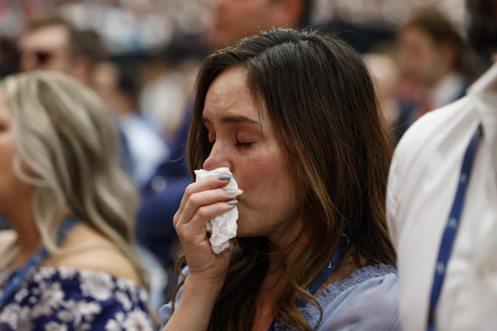Uma participante do funeral chora durante o culto público em memória do ativista Charlie Kirk. Foto: EFE/EPA/CAROLINE BREHMAN (Foto: EFE)