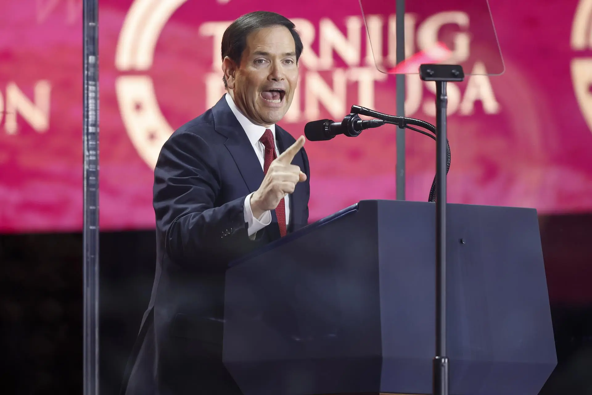 O Secretário de Estado dos EUA, Marco Rubio, discursando no funeral de Charlie Kirk. Foto: EFE/EPA/CAROLINE BREHMAN