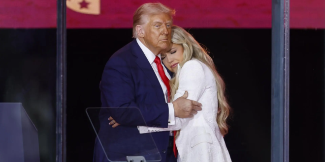 O presidente dos EUA, Donald Trump, e Erika Kirk, esposa de Charlie Kirk, se abraçando no palco durante o funeral público do ativista político no Arizona. Foto: EFE/EPA/CAROLINE BREHMAN (Foto: EFE/EPA/CAROLINE BREHMAN)